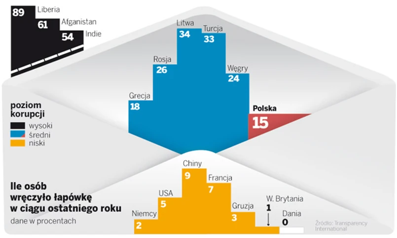 Najlepsza sytuacja jest w Danii (0 proc.). Spośród 91,5 tys. osób z 86 krajów świata do wręczenia łapówki przyznała się co czwarta.