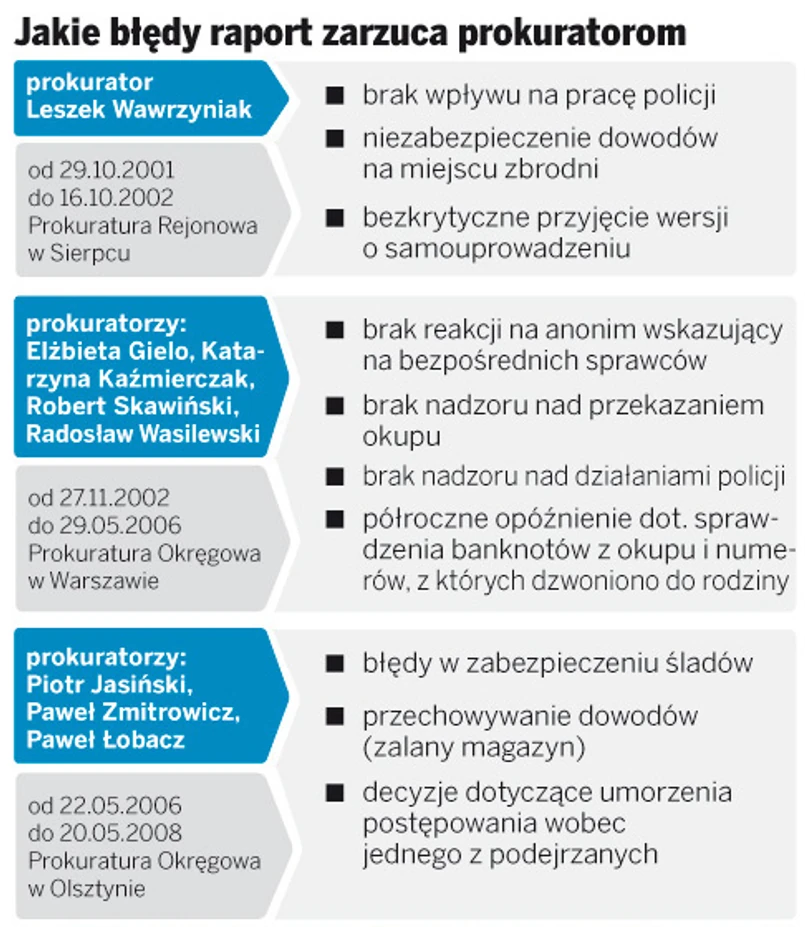 ● Jako pierwszy porwaniem zajął się prokurator z najmniejszym doświadczeniem w Prokuraturze Rejonowej w Sierpcu. – Wiedzę o tak poważnych sprawach, jak sam przyznał, czerpał z lektur – napisali posłowie. W efekcie nie zabezpieczono dowodów nawet w domu, z którego został porwany młody biznesmen. Nowe ślady odnaleźli prokuratorzy, którzy wrócili w to miejsce dopiero po upływie ośmiu lat.