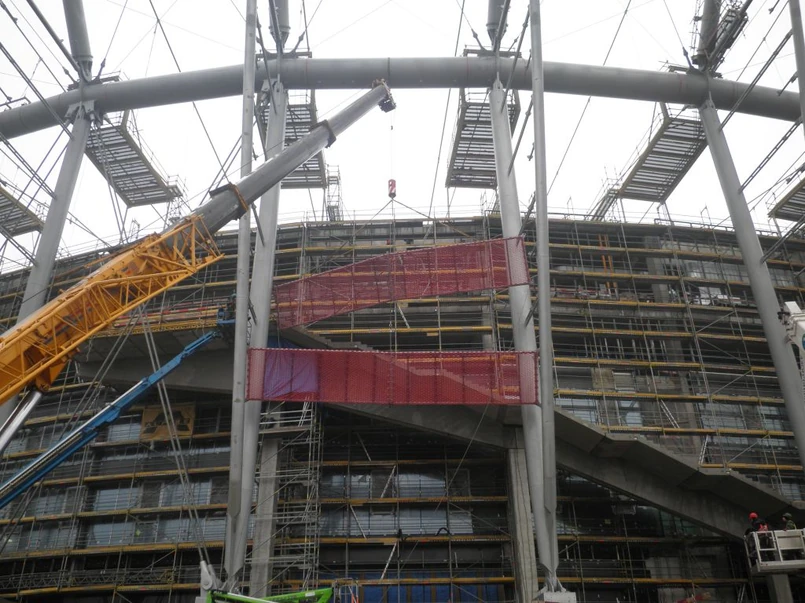 Montaż elewacji polega na zamocowaniu prefabrykatów - ramek stalowych połączonych z siatką aluminiową - do konstrukcji stalowej wokół bryły Stadionu. Łączna powierzchnia zewnętrznej elewacji to ponad 20 tysięcy metrów kwadratowych. Złoży się na nią około 800 prefabrykatów.