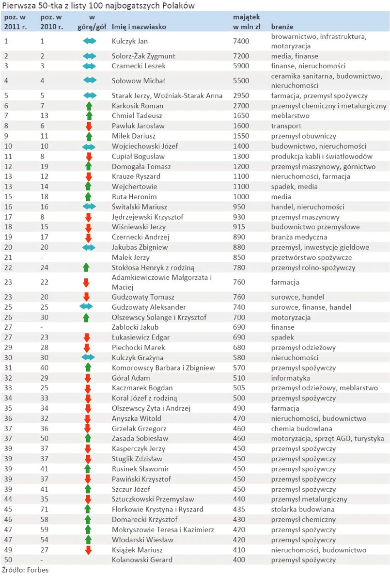 Najważniejszym składnikiem majątku Jana Kulczyka są udziały w SABMIller. W 2010 roku inwestor sprzedał część akcji, schodząc w udziałach z pozycji 3,8 do 3,1 procent. - informuje "Forbes". Drugi w zestawieniu Zygmunt Solorz-Żak jest właścicielem m.in. PTE Polsat, Invest Banku i Cyfrowego Polsatu. Pod koniec zeszłego roku sprzedał platformie cyfrowej 85 procent udziałów w Telewizji Polsat. Na trzecim miejscu, z majątkiem szacowanym na około 5,9 mld zł, znalazł się Leszek Czarnecki - twórca grupy finansowej Getin Holding, główny udziałowiec deweloperskiej spółki LC Corp.