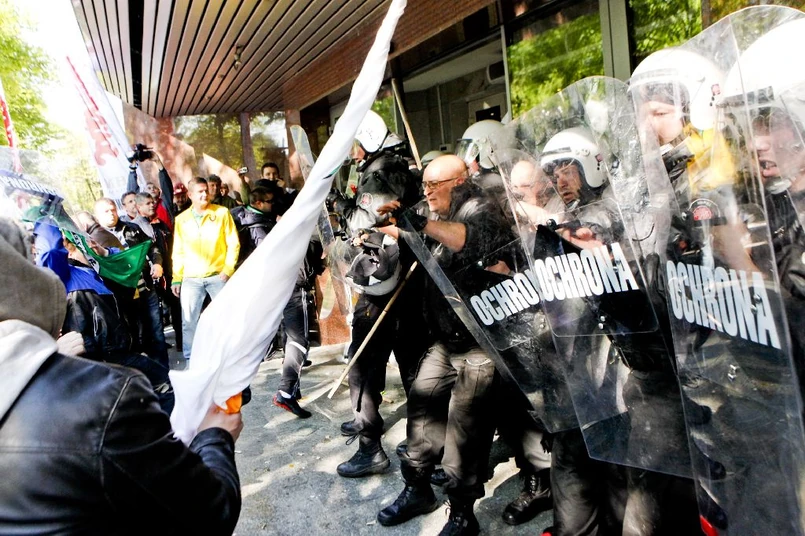 Gdy wydawało się, że pikieta dobiega końca, część związkowców ponownie rozpoczęła forsowanie drzwi budynku zarządu. Tym razem nie chcieli współpracować m.in. ze Zbrzyznym, który nawoływał do spokoju i nie wywarzania drzwi. Manifestujący wyłamali jednak drzwi, ale do środka nie weszli, gdyż w siedzibie spółki czekał kordon policji oraz ochrona.