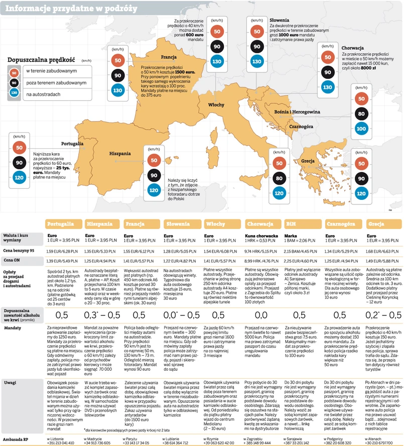 Na szczęście policja w krajach śródziemnomorskich jest znacznie bardziej pobłażliwa w stosunku do zagranicznych turystów niż tamtejsi operatorzy autostrad. Choć oficjalne stawki w lokalnych taryfikatorach przyprawiają o zawrót głowy, to na drobne wykroczenia mundurowi we Włoszech, Grecji czy Chorwacji przymykają oko. Mniej wyrozumiali są ich francuscy i hiszpańscy koledzy, ale również nie można powiedzieć, że się czepiają.