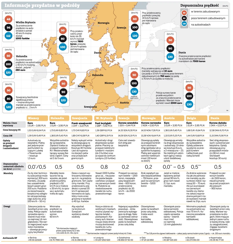 Podobnie jest w krajach skandynawskich, Austrii czy Szwajcarii. Ten ostatni kraj słynie z bezwzględnego egzekwowania przepisów ruchu drogowego – znane są sytuacje, gdy do polskich kierowców docierały mandaty za przekroczenie prędkości o 3 km/h, opiewające na kwotę zaledwie 20 franków. Dla Szwajcarów nie ma znaczenia to, że koszty wyegzekwowania takich kar znacznie przekraczają wartość mandatów.