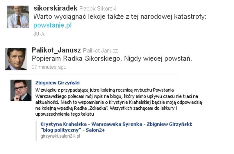 Sikorski w sobotę zamieścił na twitterze wpis: "warto wyciągnąć lekcje także z tej narodowej katastrofy", do którego dołączył link do strony internetowej www.powstanie.pl. Autorzy tej strony nazywają się "przeciwnikami kultu sprawców Powstania Warszawskiego".