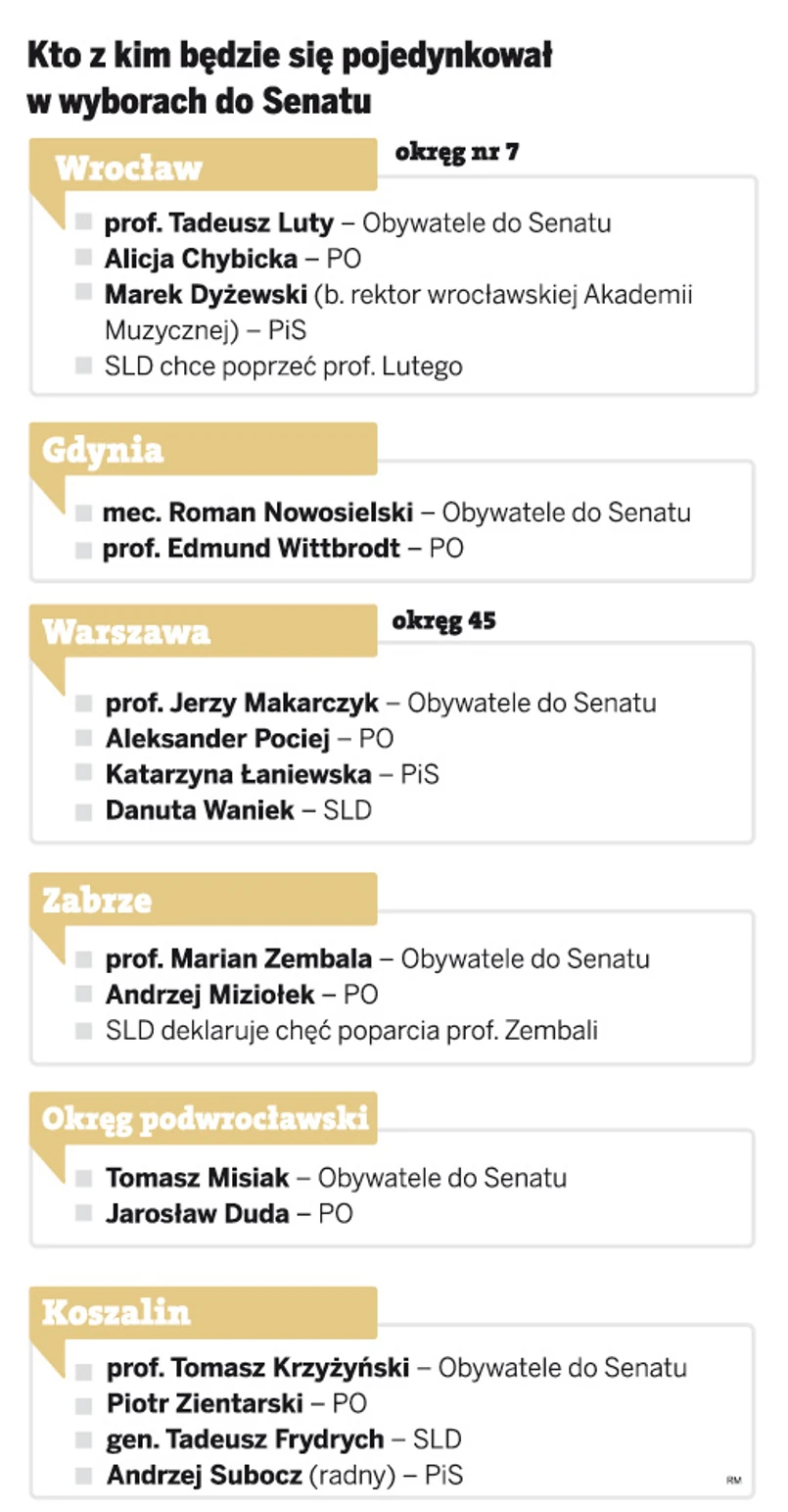 Prezydent Zabrza namawia na start sławę kardiochirurgii – prof. Mariana Zembalę – ale ten podobno jeszcze nie podjął ostatecznej decyzji. Z kolei w jednym z okręgów warszawskich wystartować ma prof. Jerzy Makarczyk – były sędzia Europejskiego Trybunału Praw Człowieka. Jak wynika z naszych informacji, poparcia ma mu osobiście udzielić były prezydent Aleksander Kwaśniewski. W Koszalinie kandydować ma prof. Tomasz Krzyżyński, rektor politechniki, w Gdyni – mec. Roman Nowosielski, a w jednym z okręgów krakowskich – były senator PO Paweł Klimowicz.
