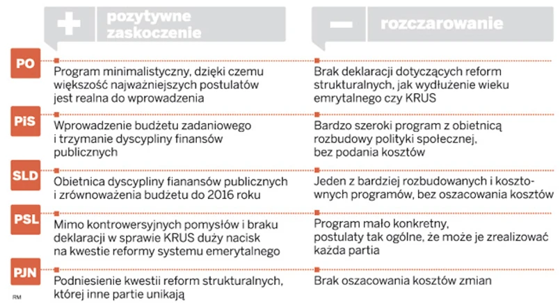 W przypadku dużych ugrupowań w niektórych kwestiach programy są minimalistyczne. Tak jak program PO, z którego pokazaniem Platforma zwlekała aż do września. Okazało się, że wycofała się z większości radykalnych propozycji znanych z poprzednich programów, a wpisała jako ważne punkty sprawy, które miały być załatwione w tej kadencji, jak np. efektywnościowa ustawa emerytalna.