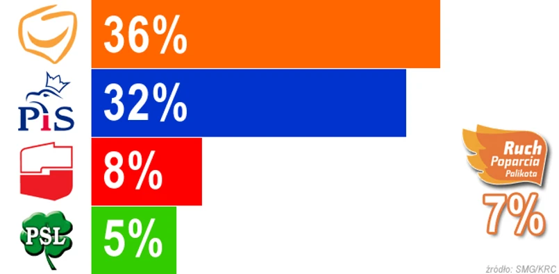 Sondaż nie przynosi niespodzianek na dwóch pierwszych miejscach – na PO głosowałoby 36 proc. wyborców, na PiS – 32 proc. Na SLD głos zadeklarowało 8 proc. pytanych, na PSL – 5 proc.