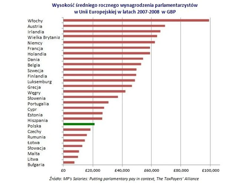 Porównując 27 parlamentów Unii Europejskiej, najwyższe wynagrodzenia w 2007 obowiązywały we Włoszech. Uposażenia poselskie w Italii znacznie przewyższały pensje przyjęte w innych krajach. W czołówce umiejscowili się również członkowie starej Unii. Na 20 pozycji, w otoczeniu państw z Europy Środkowo-Wschodniej (za wyjątkiem Hiszpanii), znalazła się Polska.