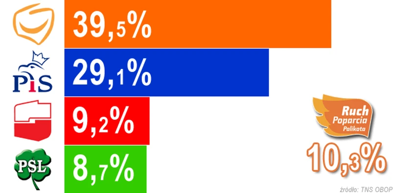 Prognoza przewiduje wysoką wygraną PO z PiS (39,5 do 29,1 proc.) oraz wyrównaną walkę o trzecie miejsce między Ruchem Palikota (10,3 proc.), SLD (9,2 proc.) i PSL (8,7 proc.).