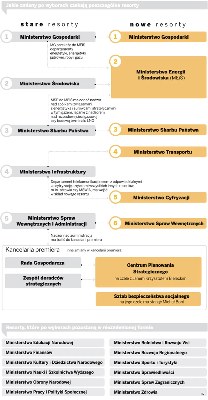 Formowanie nowego rządu oznacza konieczność obsadzenia nowych ministerstw, których powołanie jeszcze przed wyborami zapowiedział premier Donald Tusk. Kwestia resortu energetyki, który miałby zostać wyodrębniony z kompetencji Ministerstwa Gospodarki, już irytuje PSL. Z kolei MSWiA okrojone miałoby zostać z administracji. Mówi się też o podziale resortu infrastruktury na ministerstwa transportu i cyfryzacji, ale ten projekt może zostać jeszcze rozszerzony.
