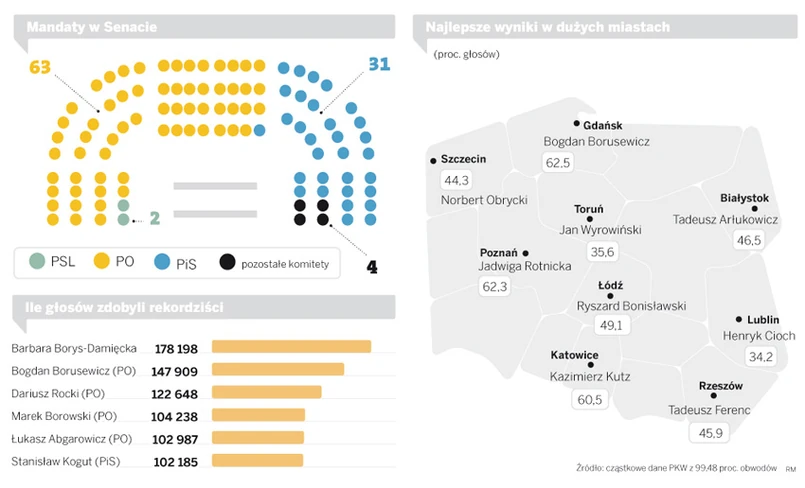 Wielkim przegranym wyborów jest Zbigniew Romaszewski z PiS, który po 22 latach stracił miejsce w Senacie. Przegrał z popieranym przez Platformę Markiem Borowskim, który uzyskał ponad 104 tys. głosów. W Warszawie PO wzięła zresztą całą pulę, osiągając imponujący wynik. Jej kandydaci albo przekroczyli 100 tys. głosów, albo prawie osiągnęli ten poziom. Tu padł zresztą rekord krajowy – Barbara Borys-Damięcka uzyskała poparcie ponad 178 tys. wyborców.