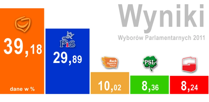 Według wyników ze 100 proc. obwodów, PO uzyskała w niedzielnych wyborach parlamentarnych 39,18 proc. głosów, PiS - 29,89 proc. Ruch Palikota uzyskał 10,02 proc. poparcia - podała w poniedziałek wieczorem PKW.PSL dostało 8,36 proc. głosów, SLD uzyskał 8,24 proc., Polska Jest Najważniejsza - 2,19 proc., Nowa Prawica - 1,06 proc. głosów, Polska Partia Pracy - Sierpień '80 - 0,55 proc.
