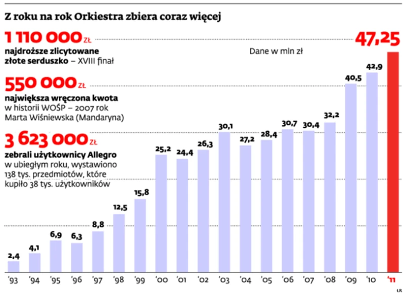 Wzrost popularności Orkiestry robi wrażenie: w pierwszym roku grania zebrała 2,42 mln złotych, w następnym 4,13 mln, dziesiąty finał zaowocował przeszło 26 mln złotych, a w ubiegłorocznym dziewiętnastym z kolei finale zebrano już 47,2 mln. W tym roku rekord zapewne znowu tradycyjnie zostanie pobity. Za zebrane do tej pory pieniądze kupiono w sumie sprzęt medyczny do ratowania zdrowia i życia dla ponad 650 szpitali. W większości były to placówki wyspecjalizowane w leczeniu dzieci.