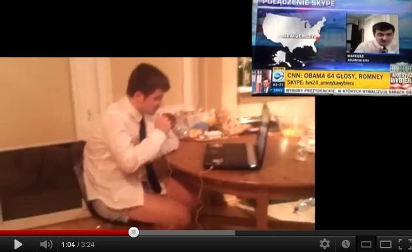 Pan Mateusz przez dwie minuty relacjonował nastroje Amerykanów w dniu wyborów. Na ekranie wszystko wyglądało w porządku: młody mężczyzna w białej koszuli, łączy się ze studiem telewizyjnym przez Skype'a. Tymczasem film, który znalazł się w Internecie pokazuje kulisy nagrania. Pan Mateusz poza białą koszulą ma na sobie tylko slipki a w tle widać typowo studenckie mieszkanie.