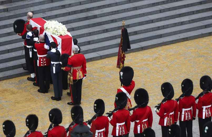 Po modlitwie w kościele Saint Clemens Danes trumna spoczęła na armatniej lawecie, ciągniętej przez sześć karych koni. Kondukt pogrzebowy przeszedł do katedry świętego Pawła. Trumnę eskortowali ubrani w galowe mundury żołnierze i marynarze z jednostek uczestniczących w wojnie o Falklandy w 1982 roku. Lawetę poprzedzali kawalerzyści w historycznych mundurach, a orkiestra Royal Marines grała marsze żałobne Beethovena, Mendelssohna i Chopina. Przemarszowi konduktu towarzyszyło bicie dzwonów i salwy armatnie, oddawane co minutę w Tower.