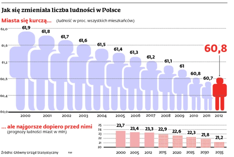 Ten trend nie jest jednak niczym nowym – jeśli wierzyć danym GUS, to od 2000 r. polskie miasta skurczyły się o ponad 330 tys. osób. Jednak zdaniem prof. Bohdana Jałowieckiego, socjologa z Uniwersytetu Warszawskiego, jest to głównie zmiana statystyczna. – Zmniejsza się tylko liczba ludności w granicach administracyjnych miast, bo część osób przenosi się na tak zwane suburbia, czyli na peryferie – ocenia naukowiec.