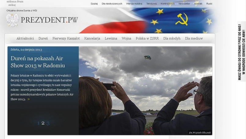 Jeden z wpisów na oficjalnej stronie prezydenta został poświęcony wizycie Bronisława Komorowskiego na pokazach Air Show w Radomiu. Wpis został również sparodiowany na stronie prezydent.pw. Czytamy na niej: "Świentem lotnictwa polskiego, lotnikuw, a takrze wszystkih pżyjaciuł polskiego - i nie tylko polskiego nieba - nazwał prezydent rozpoczęte w sobotę pokazy lotnicze". Wpis został zatytułowany "Dureń na pokazah Air Show w Radomiu".