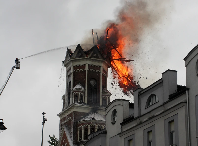Paweł Frątczak podkreśla, że gaszenie utrudniała też drewniana konstrukcja wieży. Pożar rozprzestrzeniał się bardzo szybko, a dodatkową trudnością jest blacha lub dachówka, która pokrywa wieżę. Uniemożliwia ona skuteczne dotarcie strumieniami wody do konstrukcji objętej pożarem.