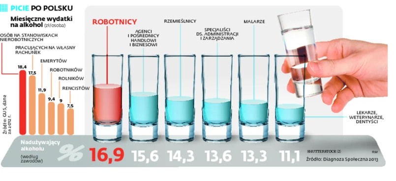 To nie znaczy, że robotnicy czy rolnicy, których wydatki na alkohol są najmniejsze, piją najmniej. Sięgają po prostu po tańszy alkohol, często z przemytu lub samogon. O tym, że w środowisku np. robotniczym nie wylewa się za kołnierz, świadczą wyniki Diagnozy Społecznej. Najbardziej dotknięci problemem alkoholowym są robotnicy budowlani (ok. 17 proc. z nich przyznaje się do nadużywania alkoholu), dalej górnicy, agenci handlowi i robotnicy w przemyśle spożywczym oraz operatorzy maszyn i urządzeń. Także lekarze znacznie częściej od średniej przyznają się do nadużywania alkoholu (11 proc.).