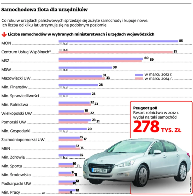 Nie brakuje też przypadków, w których urzędy są w stanie zapłacić fortunę za jeden samochód. Na przykład resort rolnictwa w 2012 r. zdecydował się kupić peugeota 508 za 278 tys. zł. Dla porównania podlaski urząd wojewódzki w tym samym czasie za podobną kwotę zaopatrzył się aż w trzy samochody (fiata ducato, volkswagena passata i opla zafirę). Katarzyna Pydych z instytutu KRB2B dziwi się takim zakupom, skoro auta można np. wynajmować. – Taka usługa pozostała jednak dla urzędników produktem niszowym, co nie dziwi, biorąc też pod uwagę niesprzyjający klimat wynikający z nieznajomości innych możliwości rynkowych – mówi Pydych.