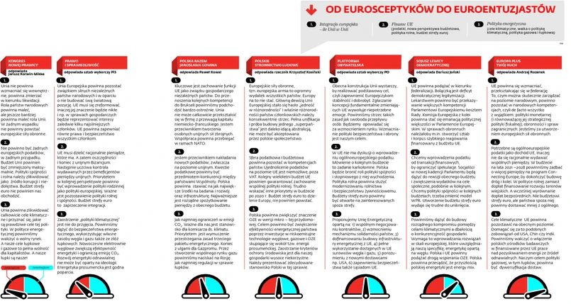 Niemal nikomu nie spieszy się do wspólnej waluty ani do unii bankowej. Tylko jedno ugrupowanie – Europa Plus Twój Ruch – chce, byśmy jak najszybciej weszli do strefy euro. Większość pozostałych ugrupowań mówi raczej o akcesji, gdy polska gospodarka będzie lepiej przygotowana. Choć są także eurosceptycy: Solidarna Polska i KNP. Podobny rozkład poglądów jest w przypadku unii bankowej. Dwa lewicowe ugrupowania popierają ten pomysł, traktując go trochę jako wstęp do strefy euro. Wstrzemięźliwość zachowują PO, PSL i Polska Razem Jarosława Gowina.