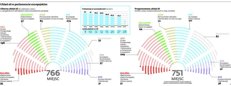 Jak te krajowe sondaże przełożą się na nowy skład Parlamentu Europejskiego? Przegranym będzie Europejska Partia Ludowa, która może nawet stracić miano najliczniejszej frakcji na rzecz socjalistów, choć ci zwiększą swój stan posiadania o maksymalnie kilkanaście mandatów. Więcej w europarlamencie będzie przedstawicieli skrajnej lewicy, a zdecydowanie więcej – skrajnej prawicy i eurosceptyków. Deputowani, kontestujący ideę integracji, będą stanowić około jednej piątej całego składu izby. Na razie w większości są oni uwzględniani jako niezrzeszeni, ale mogliby stworzyć trzecią co do wielkości frakcję, co byłoby ich historycznym sukcesem. Na pewno historycznie niska będzie za to frekwencja – mimo że rola Parlamentu Europejskiego rośnie, to z każdymi kolejnymi wyborami liczba głosujących spada. W tym roku po raz pierwszy może zejść poniżej 40 proc.