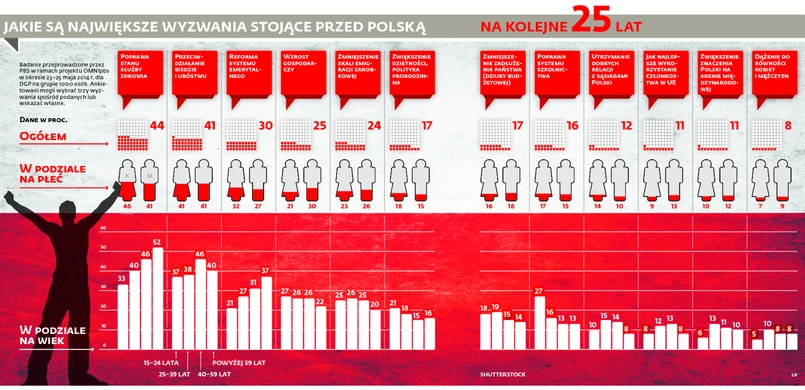 Nie bez przyczyny na konieczność poprawy sytuacji w służbie zdrowia najczęściej wskazywały osoby powyżej 59. roku życia (51,7 proc. wskazań), a tylko 33 proc. młodych osób w wieku 15–24 lata. To starsi chorują najczęściej i to im zależy na efektywnej służbie zdrowa, która dzisiaj w Polsce z efektywnością ma niewiele wspólnego. Podobną tendencję widać w odniesieniu do reformy systemu emerytalnego. Z kolei jeśli chodzi o postulat napędzania wzrostu gospodarczego, co wiąże się z perspektywą wyższych zarobków, jest to kwestia ważniejsza dla ludzi młodych. Podobnie jak zmniejszenie skali emigracji zarobkowej. Młodzi zamiast być zmuszanymi do emigracji, woleliby zarabiać na życie w kraju.