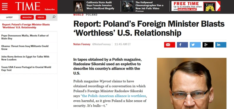 Amerykański Time przypomina, że Sikorski jest kandydatem na następcę na stanowisku szefa unijnej dyplomacji. Dodaje, że był on w przeszłości zwolennikiem bliskich kontaktów z USA, ale w ostatnich latach stał się bardziej krytyczny wobec działań Waszyngtonu.