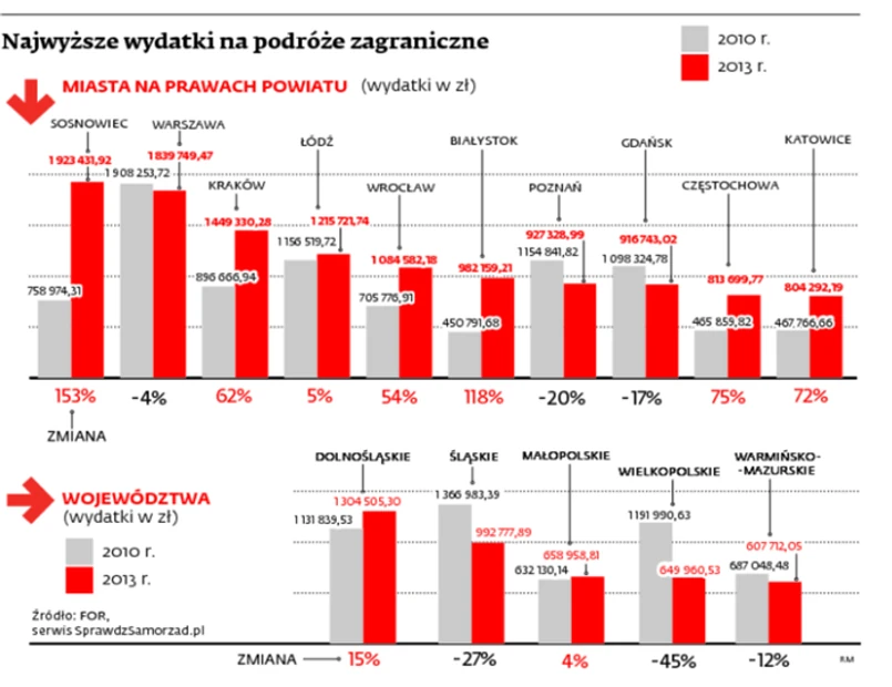 W pierwszej dziesiątce najchętniej podróżujących samorządów znalazły się: Sosnowiec, Warszawa, Kraków, woj. dolnośląskie, Łódź, Wrocław, woj. śląskie, Białystok, Poznań i Gdańsk. Tylko ta dziesiątka łącznie w 2013 r. wydała ponad 12,6 mln zł na wyjazdy zagraniczne, z których korzystali m.in. urzędnicy, lokalni politycy i pracownicy administracji publicznej. Jak wynika z danych zebranych przez Forum Obywatelskiego Rozwoju w ramach serwisu Sprawdzsamorzad.pl, wszystkie jednostki samorządu w ubiegłym roku przeznaczyły na ten cel ponad 50 mln zł, podczas gdy w 2010 r. kwota ta wynosiła 41 mln zł.