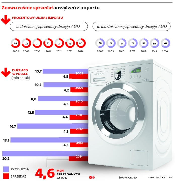Z taśm produkcyjnych 20 fabryk zlokalizowanych na terenie Polski zjechało w sumie 20,2 mln sztuk pralek, lodówek, kuchenek, suszarek do ubrań, zmywarek. To o 12 proc. więcej niż w 2013 r. i prawie dwa razy więcej niż w 2010 r., kiedy w krajowych fabrykach wytworzonych zostało 10,4 mln sztuk urządzeń. Choć nasz kraj jest europejskim potentatem w dziedzinie produkcji sprzętu gospodarstwa domowego, to w polskich sklepach nadal łatwiej znaleźć urządzenia pochodzące z importu. Co więcej, zainteresowanie nimi znowu zaczęło rosnąć. W efekcie w ubiegłym roku ich udział w całości sprzedaży dużego AGD, która sięgnęła 4,6 mln sztuk, wyniósł już 80 proc.