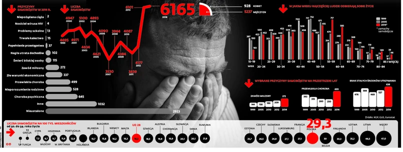 Z roku na rok rośnie liczba samobójców, których do czynu popycha zawód miłosny. W 1999 r. było ich 144, w roku 2012 – 209. Przybywa też tych, którzy nie chcą już dłużej zmagać się z chorobą przewlekłą. Tylko w ciągu ostatnich pięciu lat liczba takich osób zwiększyła się z 250 do 499.