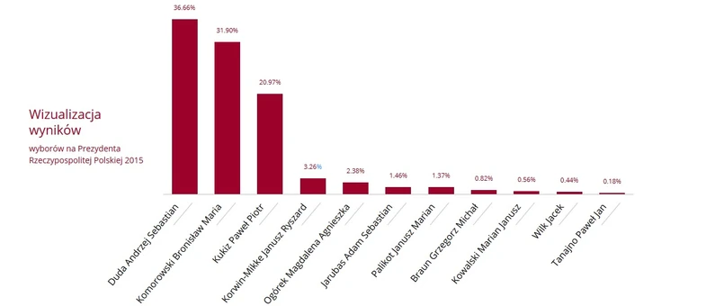 Kolejne miejsca zajął Paweł Kukiz (20,97%) Janusz Korwin-Mikke (3,26%), Magdalena Ogórek (2,38%), Adam Jarubas (1,46%), Janusz Palikot (1,37%), Grzegorz Braun (0,82%), Janusz Kowalski (0,56%), Jacek Wilk (0,44%) i Paweł Tanajno (0,18%), podała PKW na swojej stronie internetowej w poniedziałek po południu.