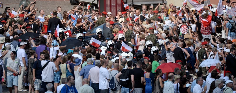 Przed Pałacem - na Krakowskim Przedmieściu zgromadziły się setki ludzi z biało-czerwonymi flagami. Tłum skandował "Andrzej Duda!" i "Witaj w domu!".
