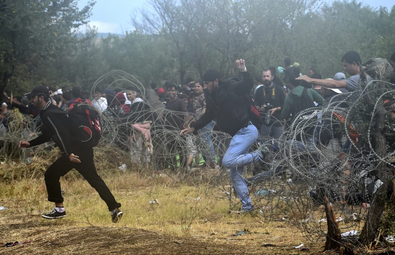 Próbująca zatrzymać migrantów policja odpaliła granaty hukowe - to jednak nie przyniosło skutku. Granice przekraczali mimo ogrodzenia zabezpieczonego drutem kolczastym.