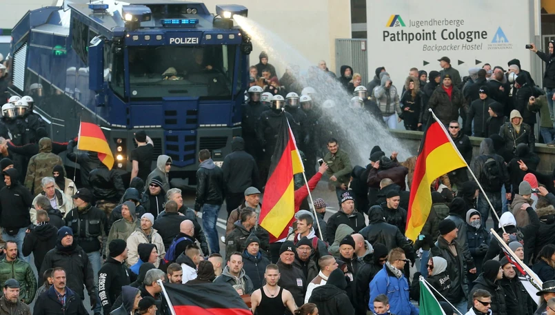 Zwolennicy Pegidy skandowali hasła typu "Nie dla imigrantów gwałcicieli", "Precz z Merkel" czy "Zakłamana prasa". Demonstranci obrzucili policję kamieniami i petardami.