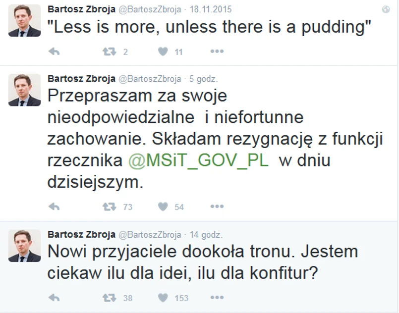 Jak podaje TVN 24, wpis, który mógł być motywem decyzji rzecznika, miał nawiązywać do rozdania nagród „Człowiek Roku 2015” Tygodnika Wprost. Zbroja zadał kłopotliwe pytanie: „Kto najlepiej nawilży” sugerując odpowiedzi: Bracia Karnowscy, Środowisko Gapola i ekipa „Wprost”. Kolejnego dnia rzecznik opublikował wpis: „przepraszam za swoje nieodpowiedzialne i niefortunne zachowanie”, rezygnując tym samym ze sprawowania urzędu.