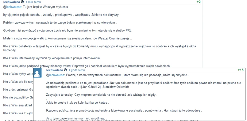 Były przywódca "Solidarności" twierdzi, że gdyby miał powtórzyć swoją życiową drogę, niczego by w niej nie zmienił. Dotyczy to również "otarcia się o służby PRL". Dodaje, że w przeszłości działał według swojej koncepcji walki z komunizmem. "Kto z Was, bohaterzy, wtargnąłby w czasie bijatyk do komendy milicji i wynegocjował wypuszczenie więźniów i o odebranie ich wystąpił z okna komendy? - pisze Lech Wałęsa. "Kto z was nie pozwoliłby, aby generał Kiszczak został premierem?" - pada kolejne pytanie na mikroblogu polskiego laureata pokojowej Nagrody Nobla.