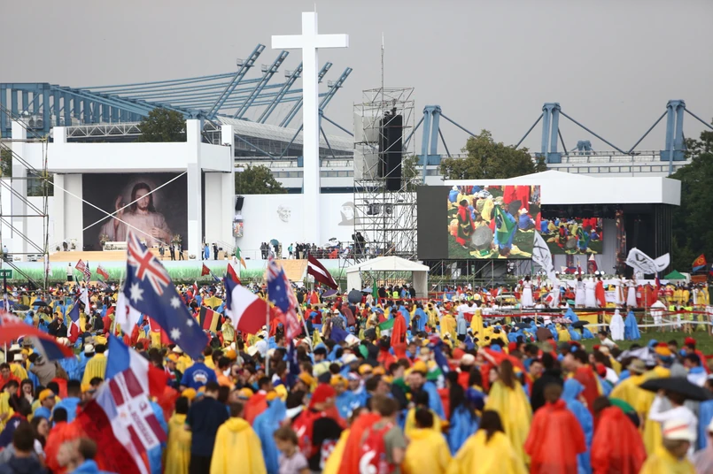 Ok. godz. 15 nad Krakowem przeszła burza, deszcz przestał padać na początku uroczystości otwierającej ŚDM. Pielgrzymi wchodzili na Błonia w kolorowych pelerynach, a biskupi - pod parasolami.