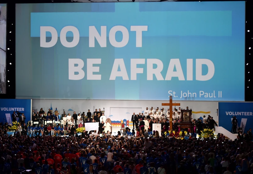 "Przed powrotem do Rzymu pragnę się z wami spotkać, a przede wszystkim podziękować każdemu z was za zaangażowanie, ofiarność i poświęcenie, z jakimi towarzyszyliście, pomagaliście i służyliście tysiącom młodych pielgrzymów" - powiedział papież na spotkaniu z wolontariuszami w krakowskiej Tauron Arenie.
