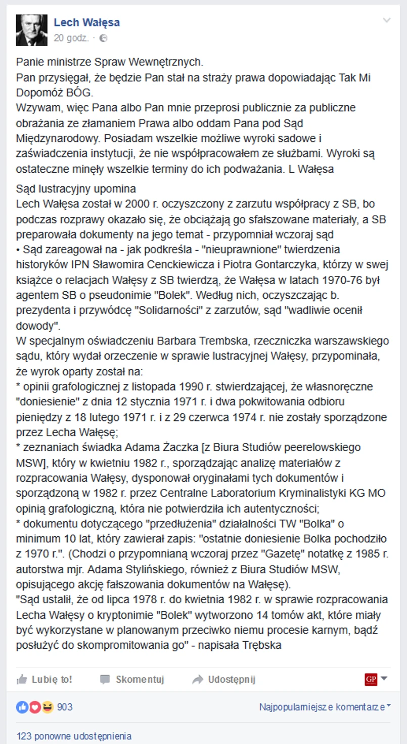 Wzywam, więc Pana albo Pan mnie przeprosi publicznie za publiczne obrażania ze złamaniem Prawa albo oddam Pana pod Sąd Międzynarodowy. Posiadam wszelkie możliwe wyroki sadowe i zaświadczenia instytucji, że nie współpracowałem ze służbami. Wyroki są ostateczne minęły wszelkie terminy do ich podważania. L Wałęsa"