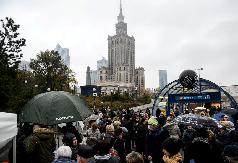 Kilkadziesiąt osób zgromadziło się także przed Rotundą. Niektórzy mieli przypięte do ubrań czarne znaczki z napisem "czarny protest".