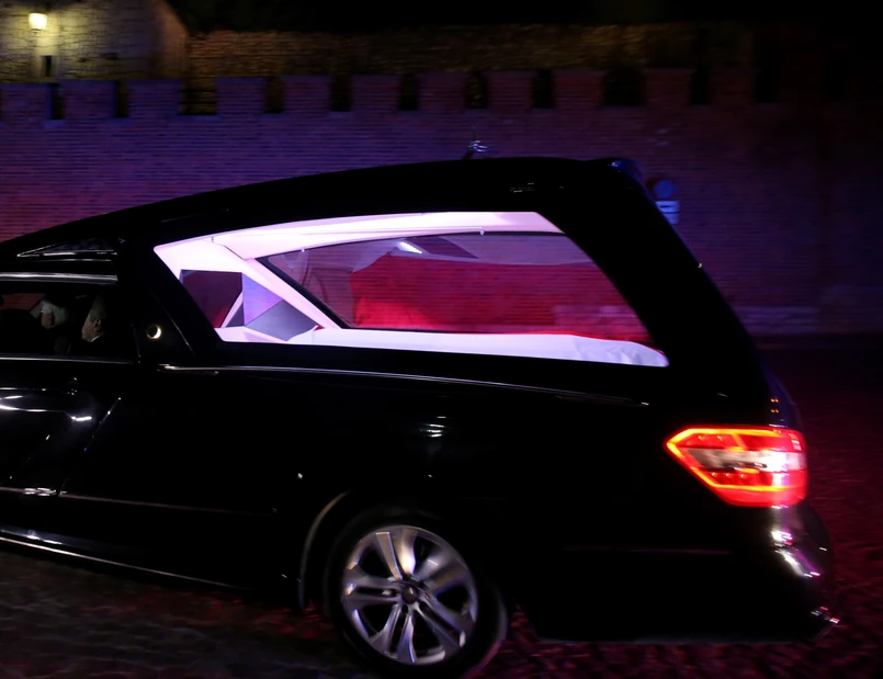 Dwa karawany, z odsłoniętymi szybami, w których spoczywały trumny przykryte flagami państwowymi z godłem wjechały na Wawel w asyście policyjnej.