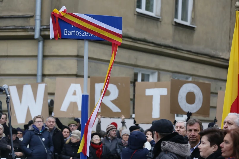 Imię Bartoszewskiego nadano obszarowi na tyłach sądu okręgowego, między ulicą Ogrodową i Elektoralną oraz między ul. Białą i aleją Jana Pawła II. W tym rejonie w trakcie II wojny światowej znajdowała się granica getta. Sądy były z niego wyłączone, Żydzi z getta wchodzili do nich od strony ul. Leszno, tam dostawali ubrania i fałszywe dokumenty, dzięki którym mogli wyjść na wolność. Pomocą zajmowała się organizacja "Żegota", w której działał Bartoszewski. Pomysłodawcą upamiętnienia Bartoszewskiego na Woli był stołeczny działacz Nowoczesnej Mariusz Malinowski.