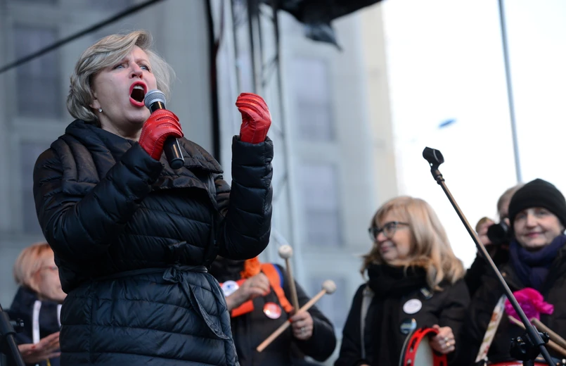 3 Na pl. Konstytucji głos zabrała m.in. aktorka Maja Ostaszewska. "8 marca jest niezwykłym dniem, w którym pokazujemy naszą godność i nie zgodzimy się zdeptanie naszej godności. W kobiecej solidarności jest niezwykła siła, której nie da się zatrzymać" - przekonywała. Zwróciła uwagę, że równouprawnienie jest ważne zarówno dla kobiet, jak i mężczyzn. "Walczymy o prawa dla nas wszystkich" - dodała., Aktorka Maja Ostaszewska na scenie podczas Międzynarodowego Strajku Kobiet, PAP/Jacek Turczyk