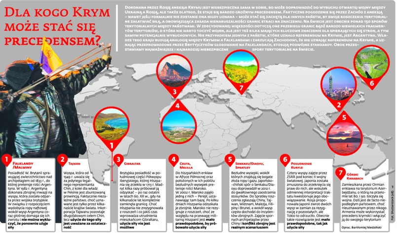 Dokonana przez Rosję aneksja Krymu jest niebezpieczna sama w sobie, bo może doprowadzić do wybuchu otwartej wojny pomiędzy Rosją a Ukrainą, ale także dlatego, że staje się groźnym precedensem. Faktyczne pogodzenie się przez Zachód z aneksją - nawet jeśli formalnie nie zostanie ona nigdy uznana - może stać się zachętą dla innych państw, by swoje roszczenia terytorialne załatwiać siłą, a obowiązująca zasada nienaruszalności granic starci na znaczeniu. Na świecie jest obecnie ponad 150 sporów terytorialnych między państwami. W zdecydowanej większości dotyczą one przebiegu granic bądź bardzo niewielkich fragmentów terytoriów, o które nie warto toczyć wojen, ale jest też kilka mających kluczowe znaczenie dla spierających się stron, a tym samym potencjalnie wybuchowych. Oto najważniejsze i najbardziej niebezpieczne spory terytorialne na świecie.