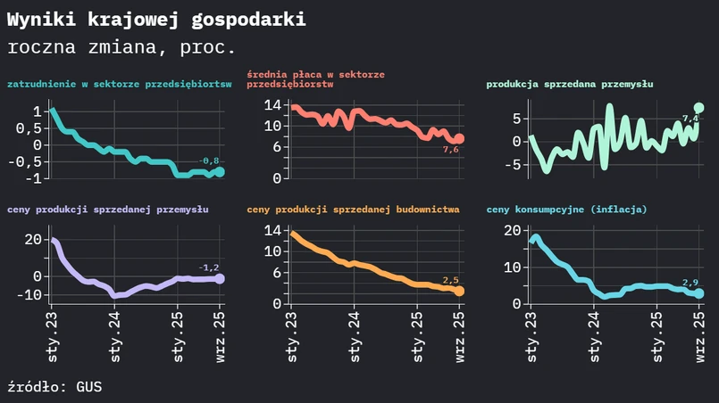 GUS podał również dane na temat tempa wzrostu cen w przemyśle i w budownictwie. W sektorze przemysłowym średnio były one o 1,2 proc. niższe niż rok wcześniej. Tempo spadku było podobne jak w sierpniu. W porównaniu z poprzednim miesiącem ceny obniżyły się o 0,2 proc.