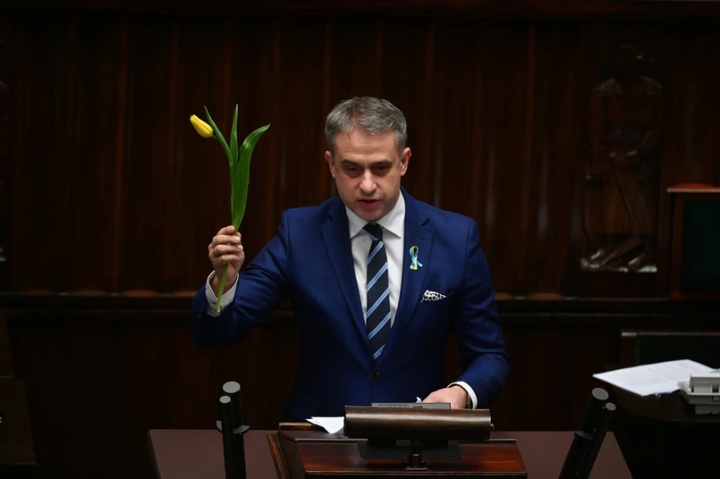 "Kobiety, dzieci, ojcowie, babcie i dziadkowie. Już niedługo oni wszyscy w Polsce będą szukać pomocy. Musimy im pomóc, bo przyjaciół poznaje się w biedzie. Otwarte drzwi dla Ukrainy to nasz wspólny obowiązek" - zaapelował w Sejmie.