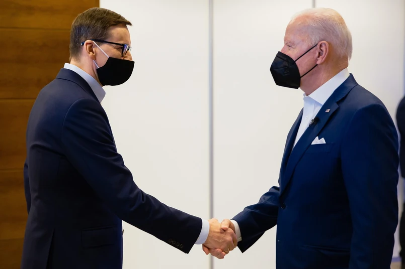 "To był bardzo intensywny i ważny dzień. Do Polski trafi duża część amerykańskich środków pomocowych dla uchodźców wojennych z Ukrainy, a Stany Zjednoczone zwiększą dostawy LNG do Europy. Jednak to, co najważniejsze widzicie na tym zdjęciu: sojusz Polski i Stanów Zjednoczonych jest silny i jest ważny dla skuteczności NATO" - napisał premier w nocy soboty na niedzielę na Facebooku. We wpisie zamieścił zdjęcie swoje z prezydentem Stanów Zjednoczonych Joe Bidenem.