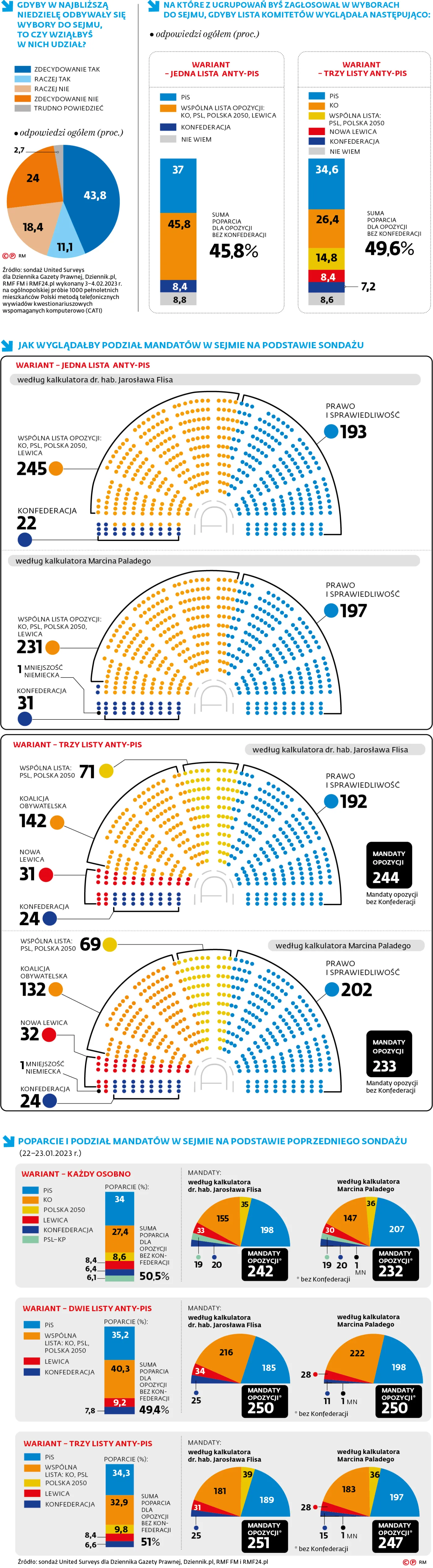 Jak wypada wariant trzech list? Wspólny start ludowców i Polski 2050 Szymona Hołowni daje im łącznie niemal 15 proc. poparcia. Startująca osobno KO zdobywa 26,4 proc., Lewica - 8,4 proc., a Konfederacja - 7,2 proc. Łącznie ugrupowania opozycyjne (bez Konfederacji) uzyskują w tym wariancie 49,6 proc. To o ok. 4 pkt proc. więcej niż przy jednej wspólnej liście. Wynik PiS: 34,6 proc. Według kalkulatora Jarosława Flisa opozycja może liczyć wtedy na 244 miejsca w Sejmie, a według kalkulatora Marcina Paladego - na 233. PiS zdobywa odpowiednio 192 lub 202 mandaty.