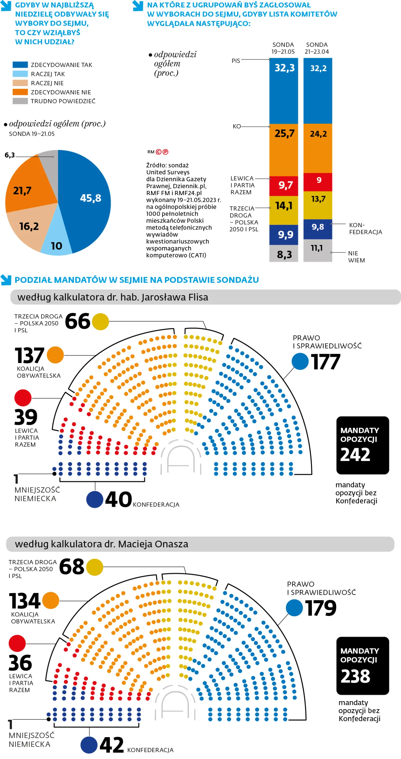 Opozycja znów nabiera wiatru w żagle. – To dobry punkt wyjścia dla opozycji i jej zwycięstwa wyborczego. Jesteśmy nastawieni na dogonienie i przegonienie PiS. Zdobycie pierwszego miejsca zapewnia swobodę w tworzeniu rządu – komentuje wyniki Jan Grabiec z PO. Jak zauważa, propozycje PiS nie przynoszą skokowego wzrostu notowań. – Ludzie realnie oceniają sytuację i nie nabierają się na takie wodotryski. Bardziej niż obietnice działa na nich ocena sytuacji, w jakiej się znajdują. To oznacza szklany sufit dla PiS – przekonuje poseł.